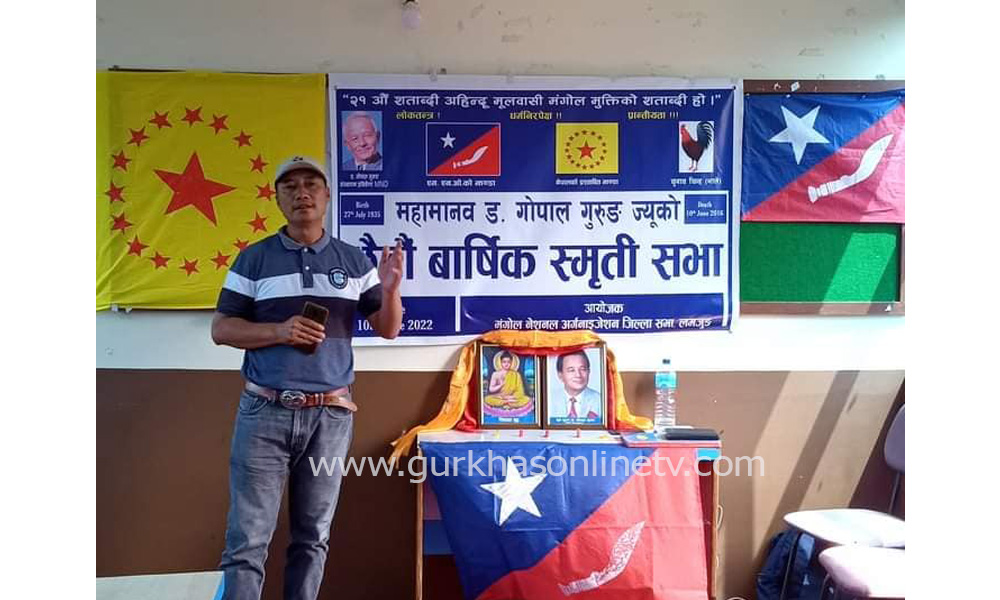 १० जुन, २०२२ को दिन एम. एन.ओ. लमजुङ जिल्ला सभाको आयोजनामा जिल्ला सभाका अध्यक्ष विकास गुरुङको सभाध्यक्षतामा र एम.एन.ओ. गण्डकी प्रदेश सभाका सदस्य कुल कुमारी गुरुङको प्रमुख आतिथ्यतामा सम्पन्न कार्यक्रमका विशिष्ट अतिथिमा गण्डकी प्रदेश सभाकै सदस्य पदम माया गुरुङ हुनुहुन्थ्यो । त्यस्तै गरि अन्य अतिथिहरुमा एम.एन.ओ., सुन्दर बजार नगर सभाका सचिव विष्णु बहादुर गुरुङ र दोर्दी गाउँ सभाका अध्यक्ष भरत बहादुर गुरुङ हुनुहुन्थ्यो । विशिष्ट अतिथि गुरुङले मुलवासी मंगोलहरु यो शताब्दीमा पनि बाहुनको अन्धभक्त भइ जातीय विषय उत्थान गरि तछाड मछाड गर्नु लाजमर्दो कुरो हो भन्नू भयो । त्यसैगरी प्रमुख अतिथी गुरुङले युगपुरुष अमर ड.गोपालप्रती श्रद्धा व्यक्त गर्नुहुँदै उहाँ युगौ युगमा यो देशको आमूल परिवर्तनको लागि जन्मिनुभएका महामान्व हुनुहुन्छ र उहाँको भौतिक शरीर हामी माझ नरहेपनी उहाँको मंगोल दर्शन अजम्बरी रहने छ र हामीले यसको संरक्षण गर्नुपर्छ भन्नुभयो । सभाध्यक्ष गुरुङले भने नेपालको राजनीतिभित्रको कर्तुतलाई प्रष्ट पार्नुहुँदै जिउँदो मानिस सरह बाचौ र अस्तित्वको वैचारिक लडाइँमा सबैजना होमिऔं तबमात्र भावी पुस्ताको भविष्य सुनौलो हुनेछ भन्नुहुदै युगपुरुष ड.गोपाल गुरुङज्युको त्याग, तपस्या र बलिदानको सम्मान गरौं भनेर सभा विसर्जन गर्नुभयो । यसरी लमजुङ जिल्लाका एम.एन.ओ.का शुभचिन्तकहरुको बाक्लो उपस्थितिमा सभ्य र भव्यरुपमा सम्पन्न भएको हो ।